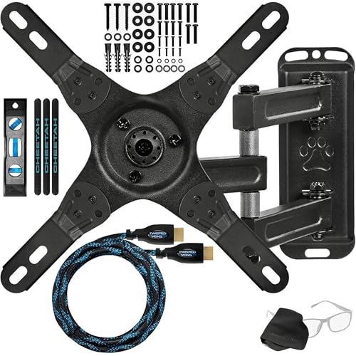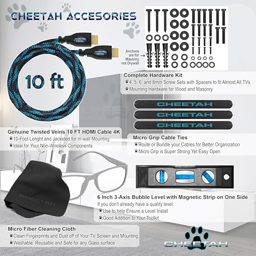 - Includes a Twisted Veins 10' 4K High Speed Ethernet HDMI cable, 6" 3-axis Magnetic Bubble Level, Microfiber Cleaning Cloth, and Universal Full Hardware Kit compatible with all brands of TV/Monitors.