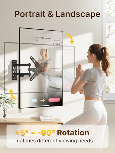 - FULL MOTION FOR OPTIMAL VIEWING: Immerse yourself with the perfect viewing angle from monTEK's articulating TV mount. Capable of tilting +5°/-15° to minimize glare, and rotating +/-90° for dynamic adjustability to achieve an optimal viewing experience (note that maximum rotation depends on screen size). In addition, it can rotate from -5° to 90° permitting landscape and portrait screen transitions to enjoy multi-functional viewing. Extendable up to 14.6 inches, it guarantees enhanced comfort from any spot in your room.