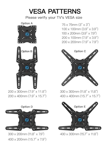 - Wide Compatibility: The Pipishell TV wall mount fits most 26"-65" TVs with VESA patterns 75x75mm up to 400x400mm. Compatible with wood stud, concrete, and brick wall mounting. Do not install the mount on drywall alone.