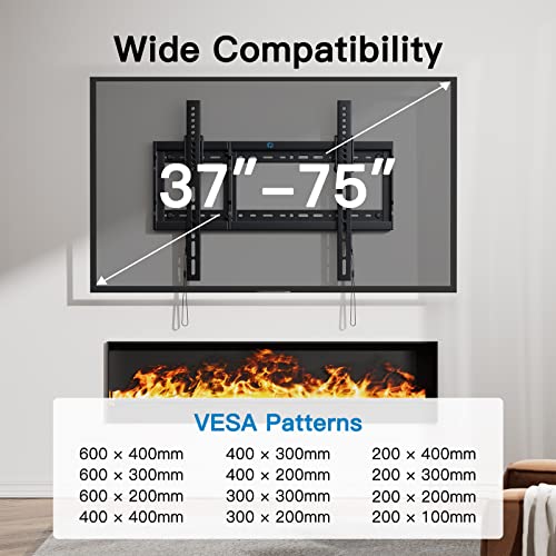- Universal Compatibility – Our ultra strong TV mount fits most 37-75 inch TVs weighing up to 132lbs. Solid and sturdy TV bracket fits VESA patterns from 200x100mm to 600x400mm. Can be mounted on 16" to 24" wood studs walls and concrete/brick walls conveniently. Please check the VESA pattern, weight, size of your TV before purchasing.