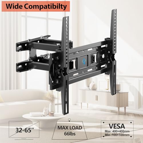 - 【VESA Mount Compatibility】Our full motion TV wall mount suitable for most 26-65 inch flat&curved TVs with Max weight capacity of 66lbs. It fits VESA patterns 400×400/400×300/400×200/300×300/300×200/200×200/ 200×100/100×100/75x75mm. Please check the VESA pattern, weight, size of your TV before purchasing.