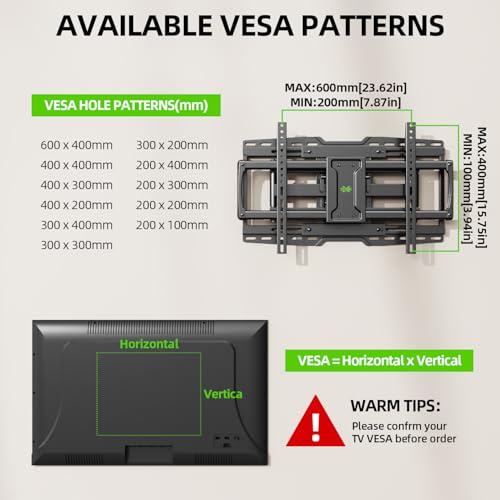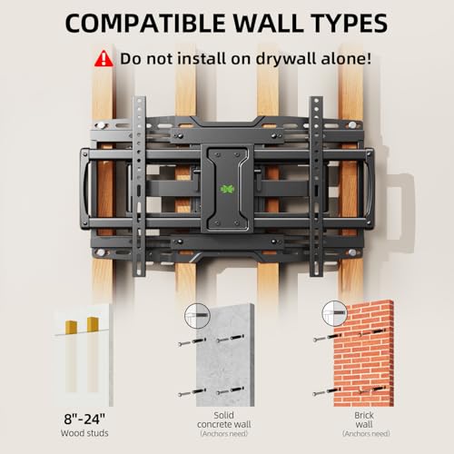 - Ultra-large and Sturdy: The upgraded TV Mount 24 inch studs fits 8" 12" 16" 18" 24" wood studs. Made of heavy-duty steel and dual articulating arms, the 85 inch TV Wall Mount is solid and durable enough to fits for TVs up to 150lbs and display sized 32-90 inch